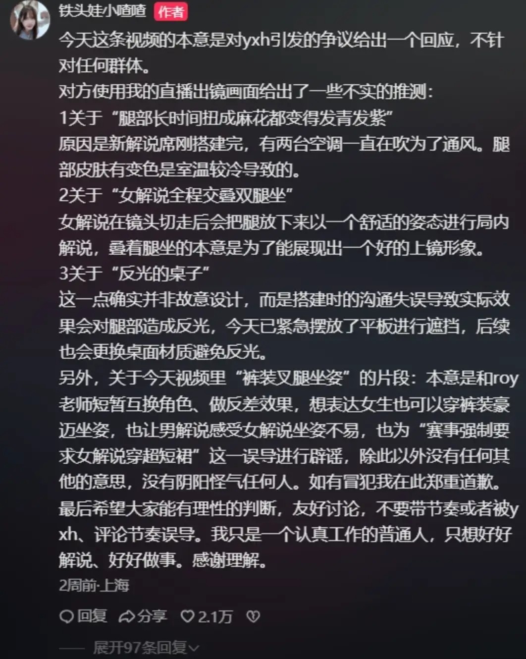 该言论发布后迅速引发争议,为此当事人“铁头娃小喳喳”也在抖音上对该话题进行回应,并且在后续的比赛解说时直接整活COS“黑皮顾清寒”。